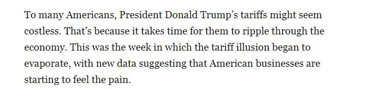 文章説,對許多美國人而言,特朗普總統的關税政策似乎毫無成本,其實這是因為關税對經濟產生的連鎖影響需要過一段時間才能顯現。而在本週,這種似乎“毫無成本”的幻覺開始消散——新數據顯示美國企業正開始感受到“切膚之痛”。