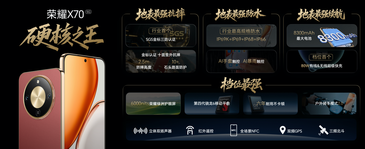 榮耀率先將目光聚焦在這一類人羣上,7月15日,榮耀發佈的榮耀X70機型,從“抗摔、防水、續航”三大維度取得突破,同時下放諸多旗艦級體驗,重構千元檔手機耐用價值體系,推動行業朝着技術普惠的方向大步邁進。