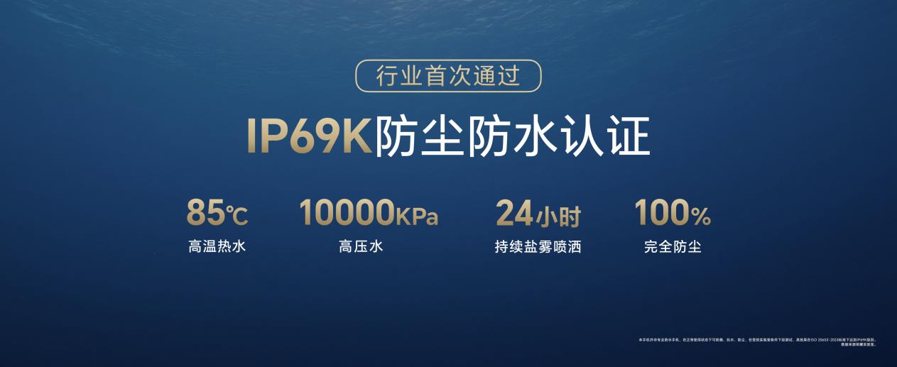 榮耀X70此次也實現了主流廠商中首個達到IP69K工業級防水標準的機型,並且同時通過了IP66、IP68、IP69等滿級防水認證。IP69K標準的測試極為嚴苛,要求手機在80-100BAR的水壓下(相當於1000米水深的壓力),承受80℃左右的熱水從10-15釐米的距離,進行0°、30°、60°、90°四個角度的旋轉沖洗,每個角度持續30秒。其防水能力,達到了與專業户外三防手機同等的水平,徹底改變了消費級手機在防水性能上的侷限。