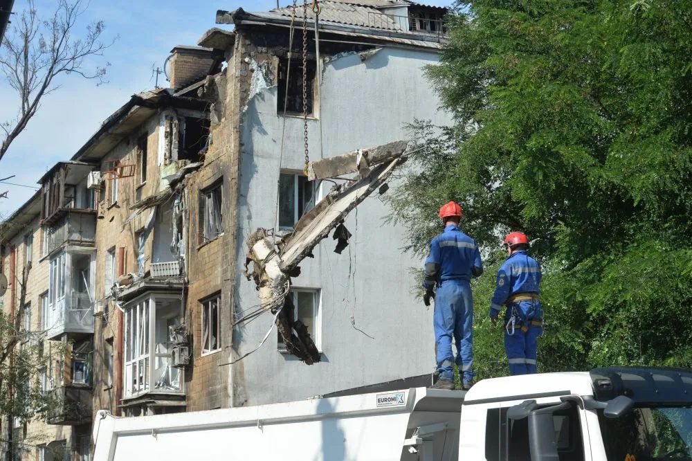 7月10日,在烏克蘭基輔市舍甫琴科夫斯基區,救援人員拆除在空襲中受損的居民樓。新華社發(彼得·德魯克攝)