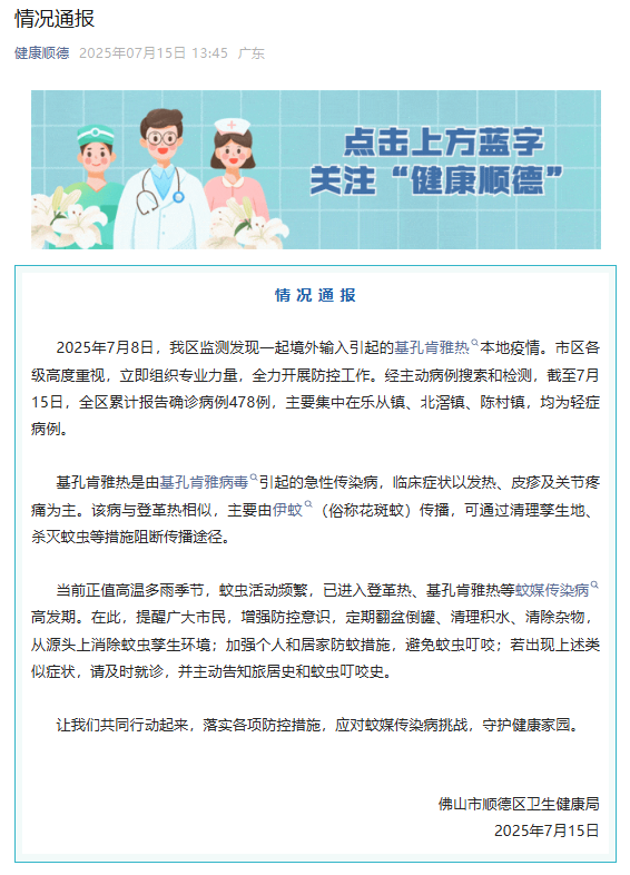 2025年7月8日,我區監測發現一起境外輸入引起的基孔肯雅熱本地疫情。市區各級高度重視,立即組織專業力量,全力開展防控工作。經主動病例搜索和檢測,截至7月15日,全區累計報告確診病例478例,主要集中在樂從鎮、北滘鎮、陳村鎮,均為輕症病例。