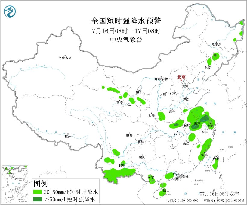 中央氣象台7月16日06時繼續**發佈強對流天氣藍色預警: