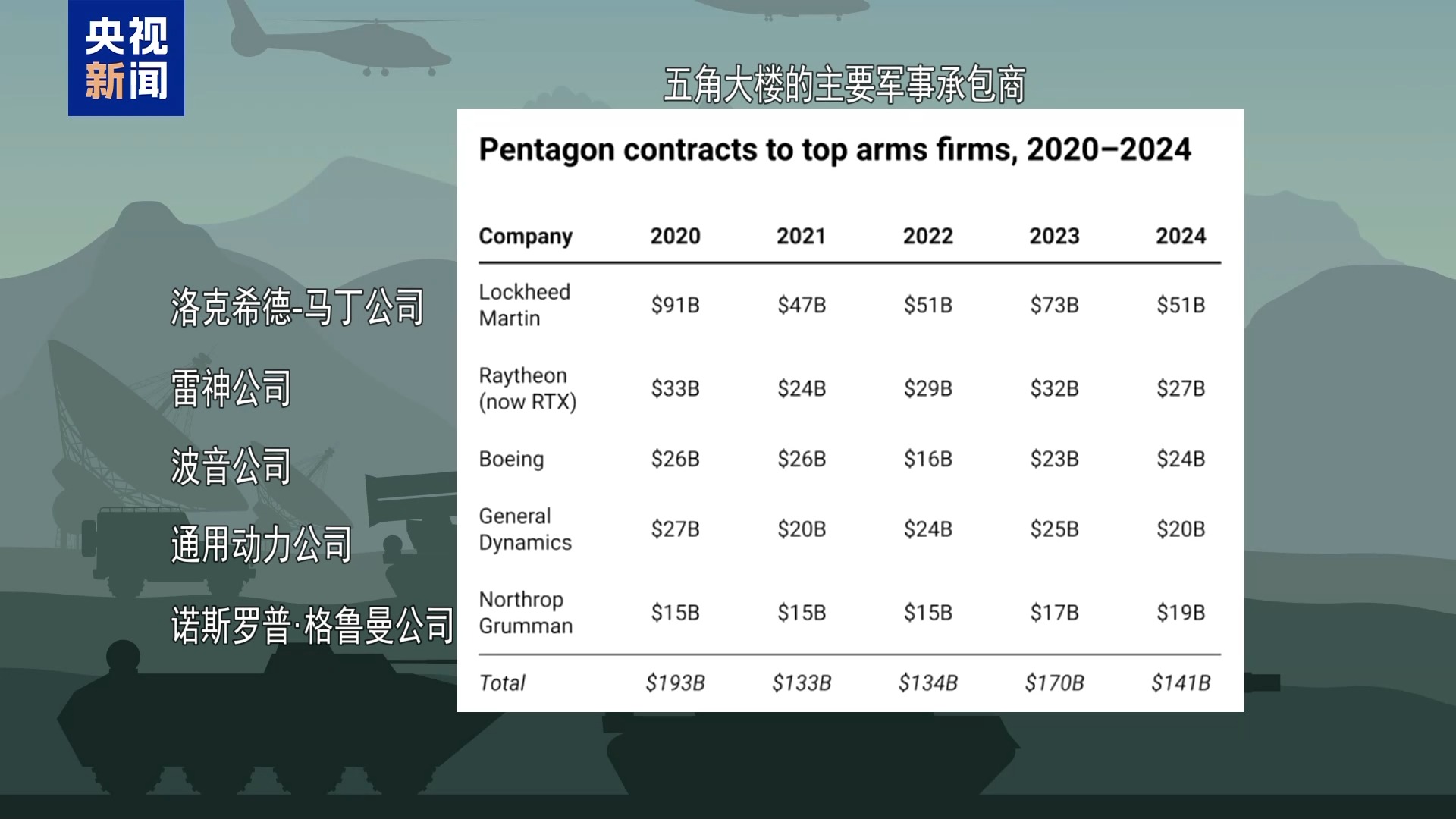 昆西治國方略研究所和布朗大學“戰爭成本核算”項目近期發佈的一份報告稱,從2020年到2024年的五年間,五角大樓54%的可自由支配開支,也就是2.4萬億美元都流向了私營公司。其中7710億美元合同流向了五大軍工巨頭,包括洛克希德-馬丁公司、雷神公司、波音公司、通用動力公司和諾斯羅普·格魯曼公司。而美國政府的最新五角大樓預算將使美國每年的軍費超過1萬億美元。