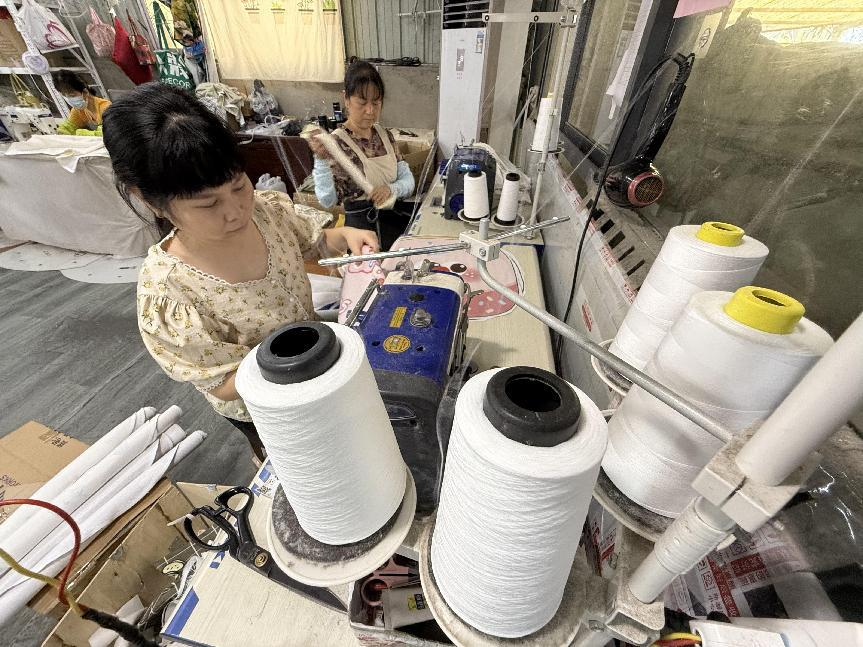 走進江西德興市新崗山鎮體泉村齊氏布藝加工廠,縫紉機針頭在布料上快速跳躍,“嗒嗒嗒”聲不斷……打包區,工人們加緊把一塊塊製作好的窗簾布裝進快遞袋。