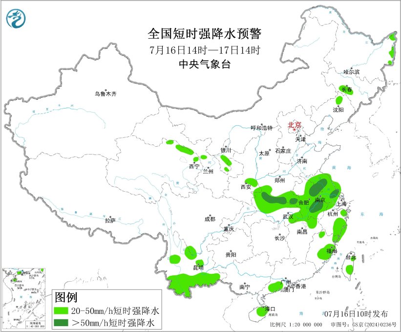 預計7月16日14時至17日14時,江淮及其東部沿海、江漢、江南地區東部、西北地區中部等地的部分地區將有8級以上雷暴大風或冰雹天氣,其中,河南東南部、安徽中部、江蘇中部等地的部分地區將有10級以上雷暴大風,最大風力可達11級以上;江淮、江漢、江南地區東部、西北地區中東部、西南地區南部等地的部分地區將有小時雨量大於20毫米的短時強降水天氣,其中,河南南部、安徽中南部、江蘇中南部、湖北北部和西部等地的部分地區小時雨量大於50毫米,最大可達70毫米以上。