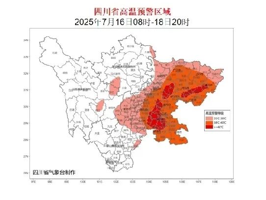 預計7月16日—18日,盆地大部日最高氣温35~39℃,其中中東部部分地方可達40℃以上;另外九寨溝、金川、丹巴、雅江、瀘定、甘洛、金陽7縣日最高氣温35~38℃。