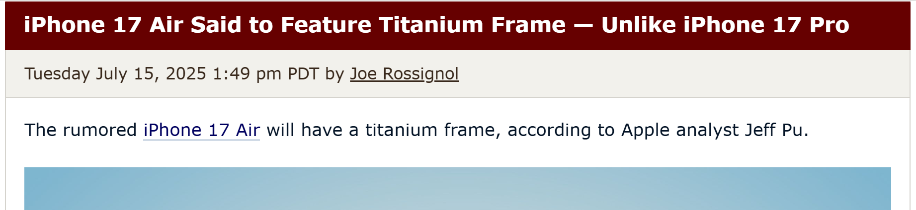 iPhone 17系列中框材質差異化 分析師:Air機型將首用鈦合金材質