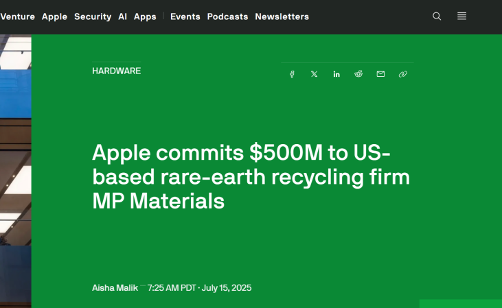 據瞭解,此次投資是蘋果公司承諾未來四年在美國投資超5000億美元計劃的一部分。值得一提的是,蘋果公司在稀土資源循環利用領域早有佈局,2019年便首次在iPhone 11的Taptic Engine中使用再生稀土元素,如今其設備上的幾乎所有磁鐵均由100%再生稀土元素製成。(純鈞)