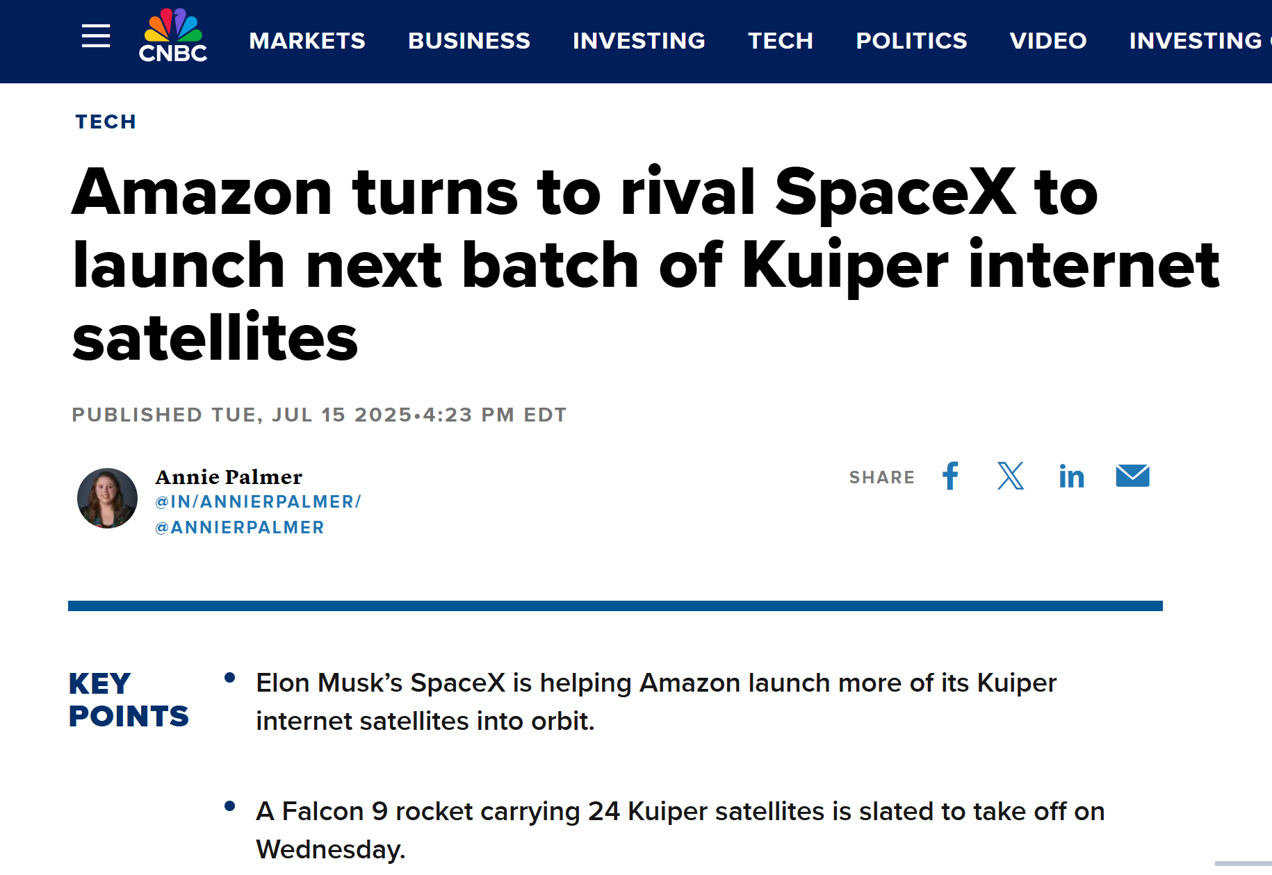 值得關注的是,亞馬遜創始人傑夫·貝索斯旗下的藍色起源,計劃未來使用其“新格倫”巨型火箭發射“柯伊伯”衞星。不過,該火箭目前僅完成一次飛行,且未能成功回收助推器。其第二次發射計劃於8月15日進行。(純鈞)