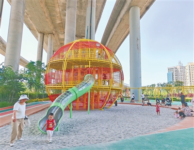 夏日傍晚,夕陽斜照。山東青島市市北區跨海大橋高架橋下的橙島時尚體育公園裏,大人散步,孩子嬉戲,一派熱鬧歡快。