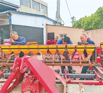 湖北省襄陽市襄州區古驛鎮,佳富天宇農機專業合作社的院子裏,一身工裝的周付喜、周成喜兄弟倆正在改裝一台高粱播種機。只見周付喜雙手抓住六方軸旋擰,穿進播種輪內,周成喜則在一旁打下手,側着頭仔細聽機器是否有異響。