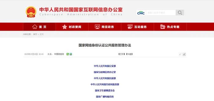 7月15日,由公安部、國家互聯網信息辦公室等六部門聯合公佈的《國家網絡身份認證公共服務管理辦法》正式施行。