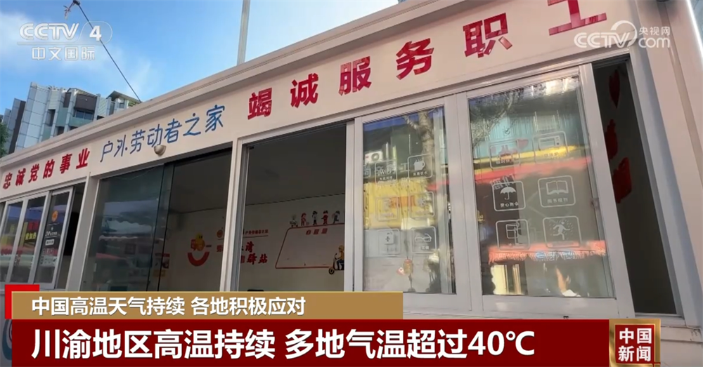而在四川廣安,15日,當地局部地區的日最高氣温達40℃以上。在烈日下,當地工會驛站成為户外勞動者歇腳的清涼港灣。