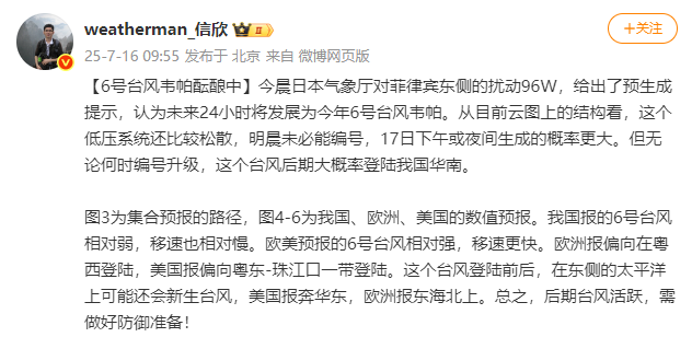 中國氣象頻道氣象分析師信欣@weatherman_信欣 今天上午發佈消息:今晨日本氣象廳對菲律賓東側的擾動96W,給出了預生成提示,認為未來24小時將發展為今年6號颱風韋帕。從目前雲圖上的結構看,這個低壓系統還比較鬆散,明晨未必能編號,17日下午或夜間生成的概率更大。但無論何時編號升級,這個颱風後期大概率登陸我國華南。