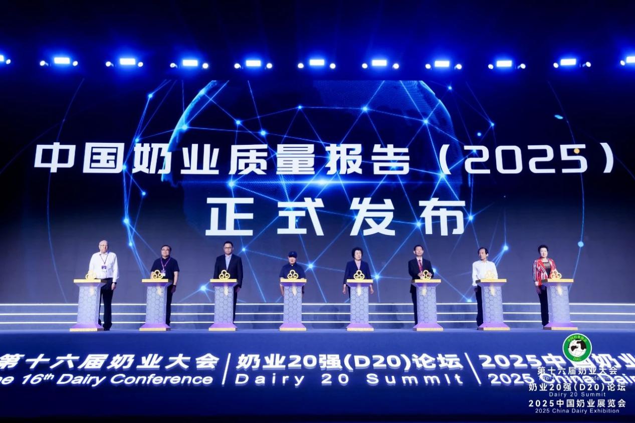 在全場熱烈的掌聲中,原農業部常務副部長劉成果,原農業部黨組成員、中國農產品市場協會會長張玉香,中國工程院院士、中國奶業協會代理會長沈建忠,農業農村部奶及奶製品質量檢驗測試中心(北京)主任王加啓,國家奶牛產業技術體系首席科學家、中國奶業協會副會長李勝利,中國農業電影電視中心原黨委書記、主任,全國性行業協會商會第四聯合黨委書記趙澤琨,中國奶業協會戰略發展工作委員會委員孫有恆、高麗娜共同登台,莊重地發佈了《中國奶業質量報告(2025)》。這份沉甸甸的報告,不僅是行業質量的“體檢報告”,更是行業信心的“實力證明”,其用詳實的數據和案例,向世界展示了中國奶業高質量發展的決心與成果。
