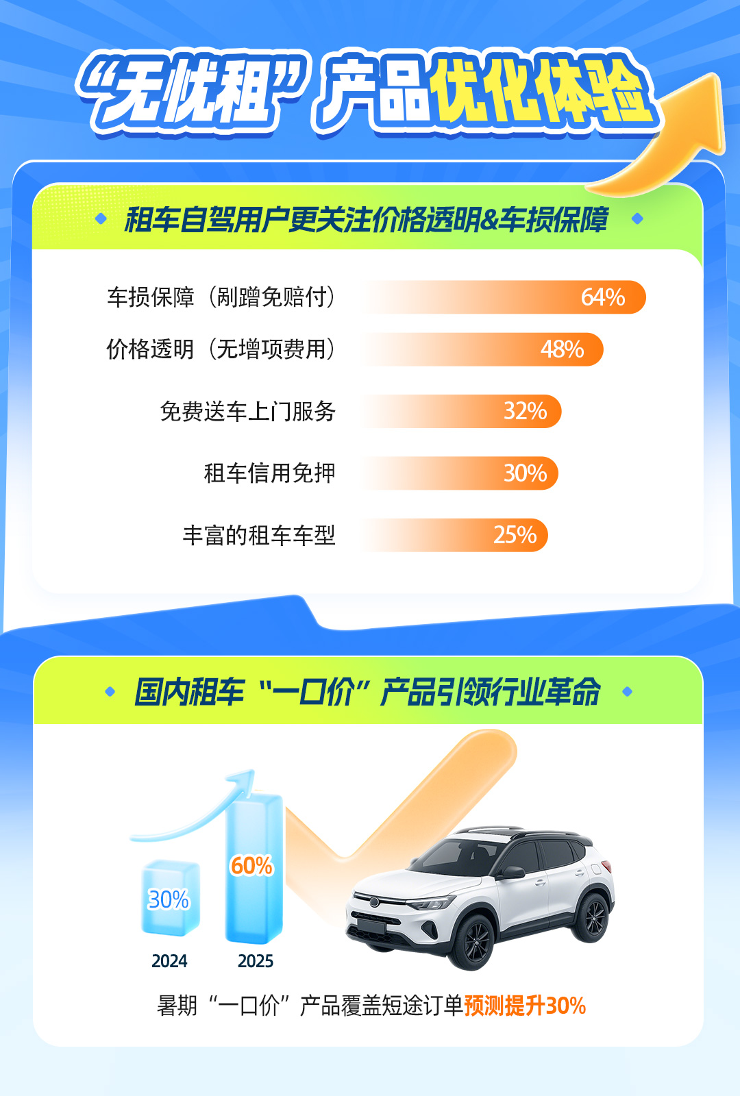 市場呼喚的“明明白白消費”正推動行業革命。報告顯示,2025年暑期,“一口價全包”租車產品將迅速普及,覆蓋60% 的國內短途訂單,預估較去年提升30個百分點。這種“所見即所得”的模式直接點燃了消費熱情,預計將推動3天以內的短途自駕訂單總量同比提升30%。