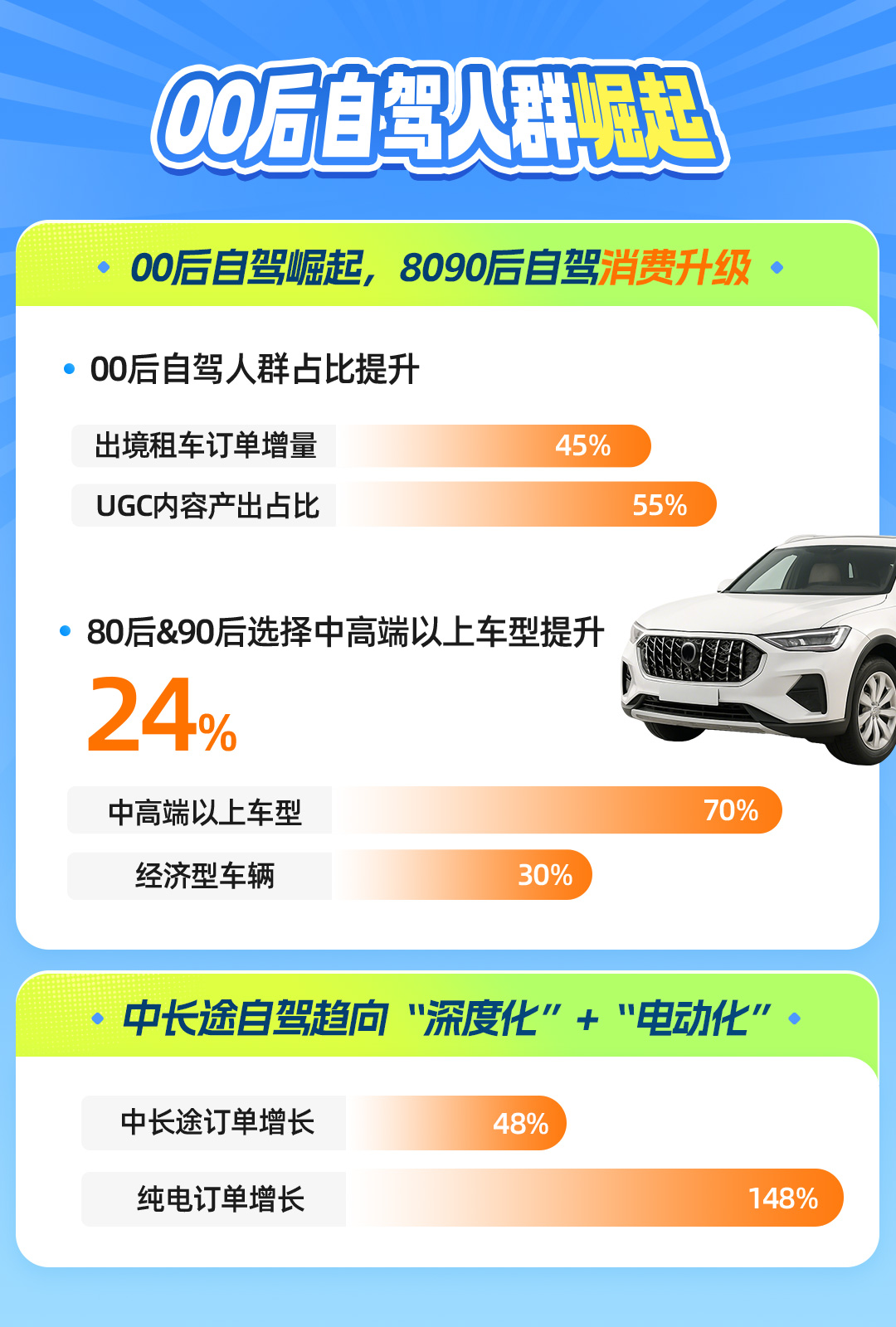 此外,自駕遊新生代崛起。暑假00後租車訂單同比增長70%,05後為代表的更年輕羣體訂單增長高達230%。同時00後貢獻出境租車訂單增量的 45%,也是社交平台內容主要生產者和傳播者,00後用户產出自駕UGC內容佔平台總量 55%。