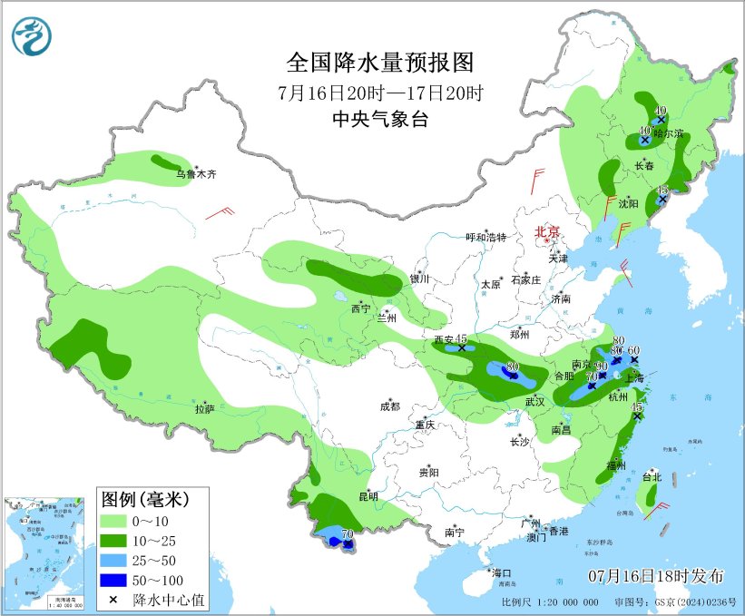 *7月16日20時至17日20時,*內蒙古東南部、黑龍江西部和南部、吉林中東部和西部、遼寧東北部、西藏西部、青海北部、甘肅河西、陝西中南部、黃淮西部、江淮大部、江漢中北部、江南北部、福建東部、雲南西南部、台灣島東部等地部分地區有中到大雨,其中,蘇皖中南部、湖北北部、雲南西南部等地部分地區有暴雨(50~90毫米)。內蒙古中部、遼寧、新疆南疆盆地、山東半島等地部分地區有4~5級風(見圖3)。
