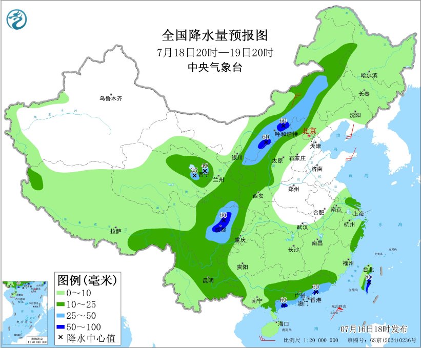 *7月18日20時至19日20時,*內蒙古中東部、青海東部、西北地區東部、西藏東南部、西南地區東部和南部、華南中東部、台灣島等地部分地區有中到大雨,其中,內蒙古中部、陝西北部、四川盆地西部、廣東西南部沿海、台灣島東部等地部分地區有暴雨(50~80毫米)。內蒙古中部、遼東半島、山東半島等地部分地區有5~6級風(見圖5)。南海中東部、巴士海峽將有7~9級風,陣風10級。