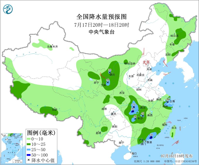 圖3 全國降水量預報圖(7月16日20時-17日20時)