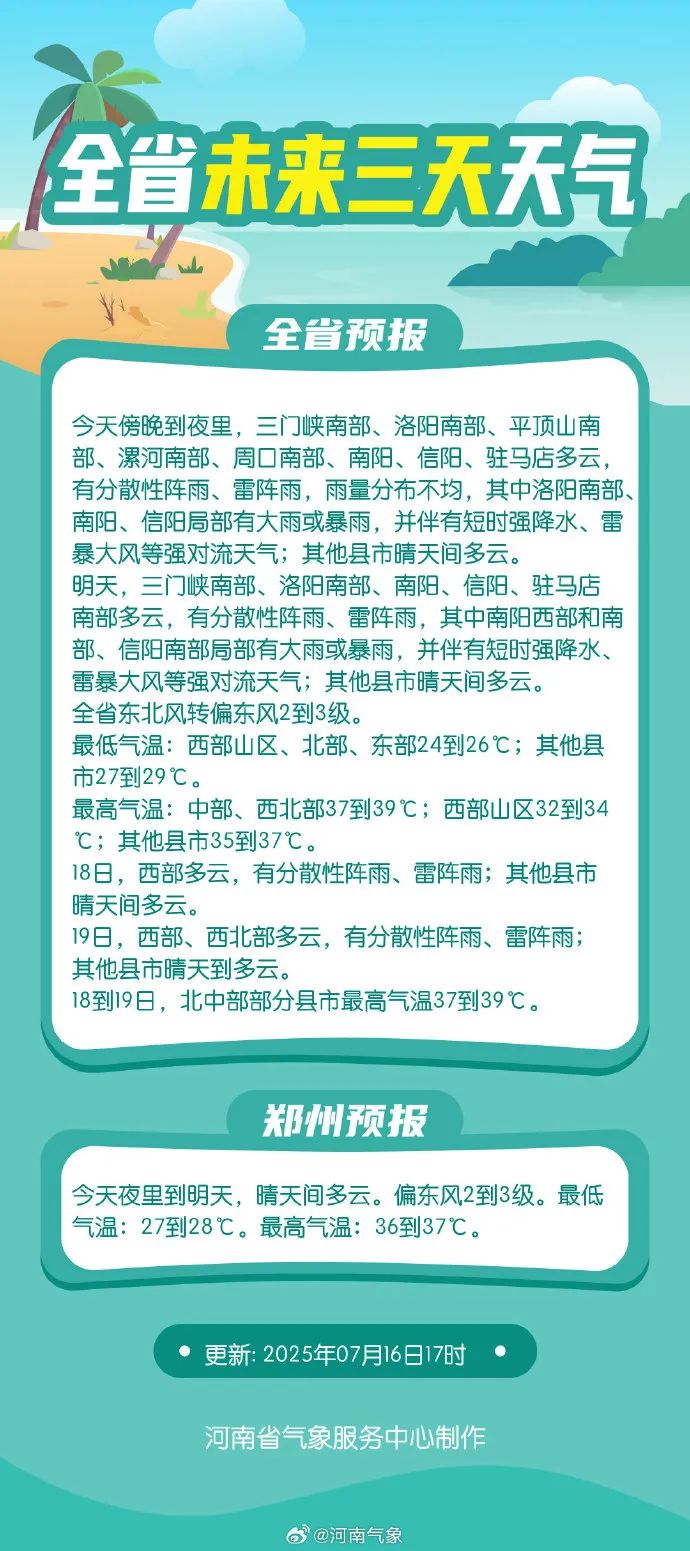 16日傍晚到夜裏,三門峽南部、洛陽南部、平頂山南部、漯河南部、周口南部、南陽、信陽、駐馬店多雲,有分散性陣雨、雷陣雨,雨量分佈不均,其中洛陽南部、南陽、信陽局部有大雨或暴雨,並伴有短時強降水、雷暴大風等強對流天氣;其他縣市晴天間多雲。