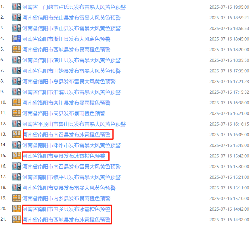 洛陽嵩縣氣象台2025年7月16日15時42分發布冰雹橙色預警信號:預計未來6小時,車村鎮、白河鎮可能出現冰雹,並可能造成雹災,請注意防範。