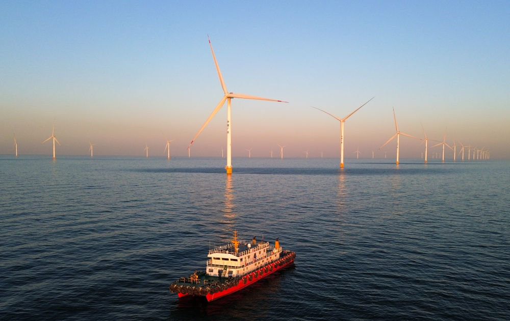 這是位於山東省萊州市海域的海上風電項目(2025年1月7日攝,無人機照片)。新華社記者 徐速繪 攝