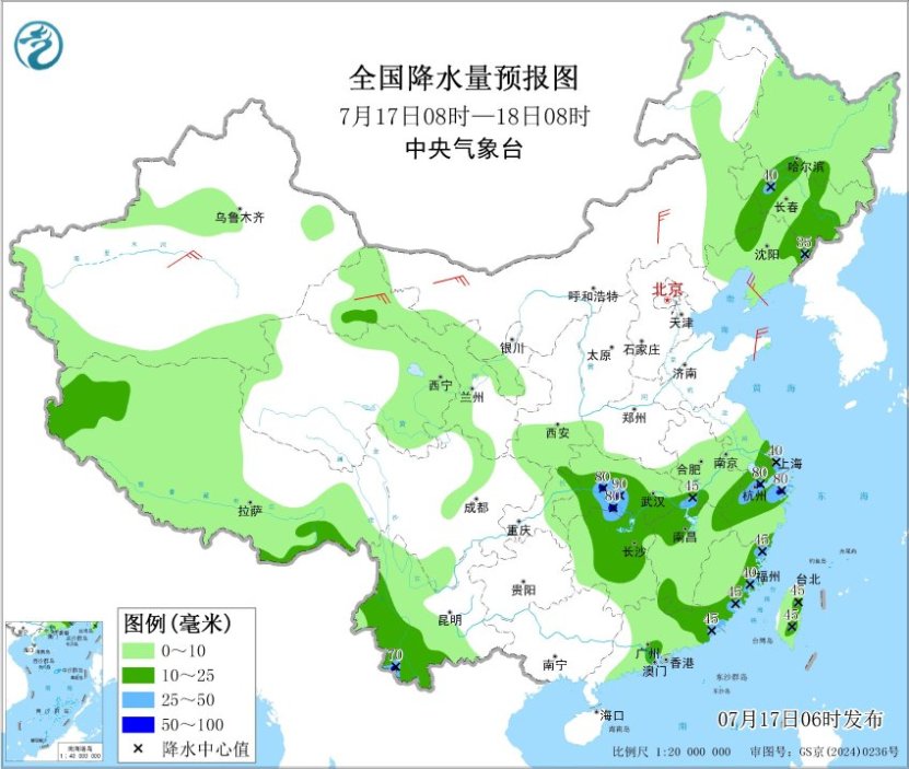 降水方面,昨日,內蒙古、吉林、江蘇、安徽、湖北及雲南等的部分地區出現較強降雨。預計未來兩天,內蒙古中東部、東北地區等地多雷陣雨,局地有大到暴雨,並伴有短時強降水、雷暴大風或冰雹等強對流天氣;江南南部、華南、雲南等地有分散性強降水,局地有大到暴雨。建議上述地區公眾及時關注最新預報預警信息,避免強降雨和強對流天氣影響時段外出。