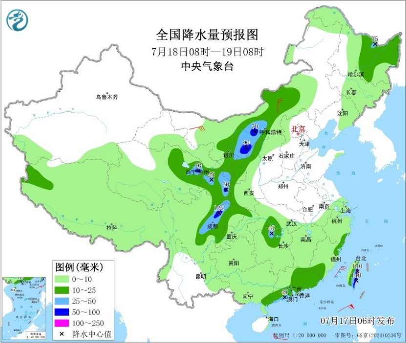 另外,明天夜間起至22日,四川盆地、西北地區中東部、內蒙古中東部、華北、黃淮、東北地區中南部將有一次降雨過程,上述部分地區有中到大雨,局地暴雨或大暴雨。