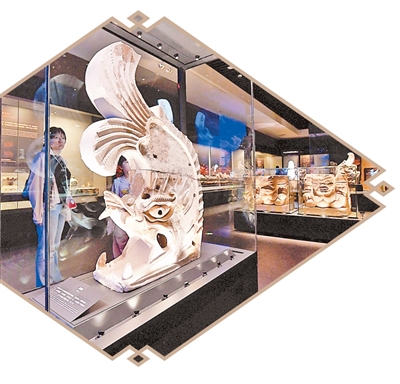 遊客在西夏陵博物館參觀文物西夏灰陶鴟吻。