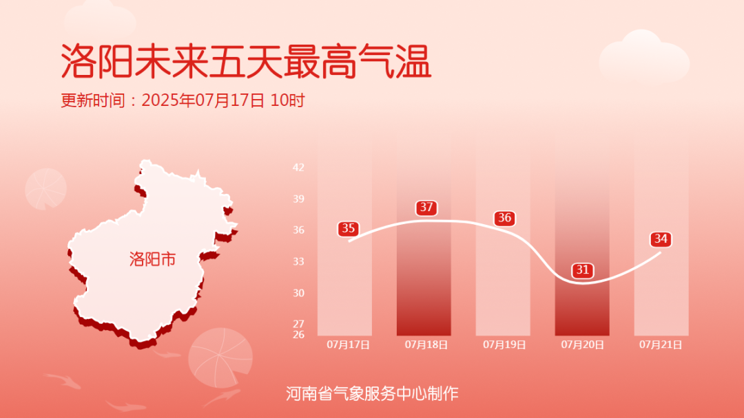 今天下午到夜裏,安陽西部、鶴壁、新鄉西部、三門峽、洛陽、南陽、信陽多雲,有分散性陣雨、雷陣雨,局地伴有短時強降水、雷暴大風等強對流天氣;其他縣市晴天間多雲。中部、西部部分縣市最高氣温37到39℃。