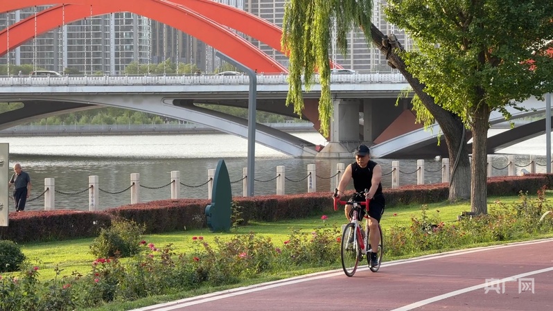 市民在汾河景區自行車專用道騎行(央廣網記者 張晉鵬 攝)