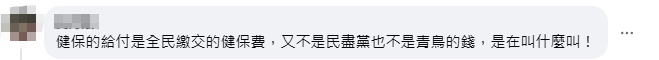 蔡正元16日也在社交媒體臉書也發佈了相關帖文,有網友在評論區留言批評“青鳥”稱,“健保的給付是民眾繳交的健保費,又不是民進黨、青鳥的錢,在叫什麼叫!”