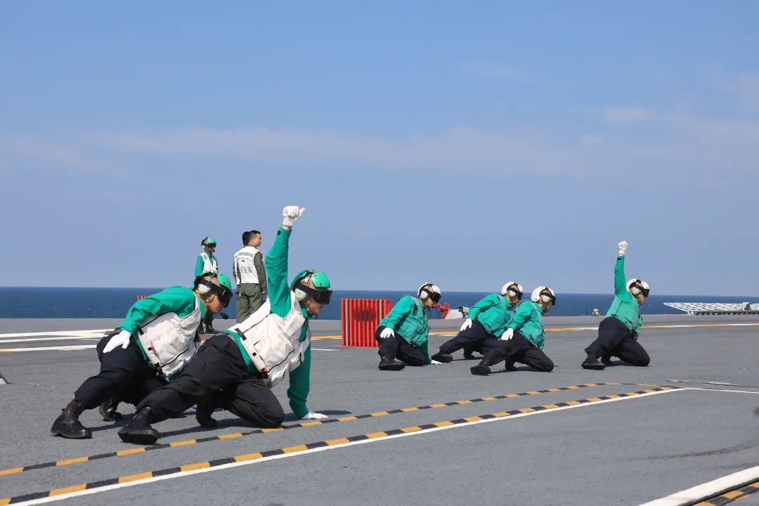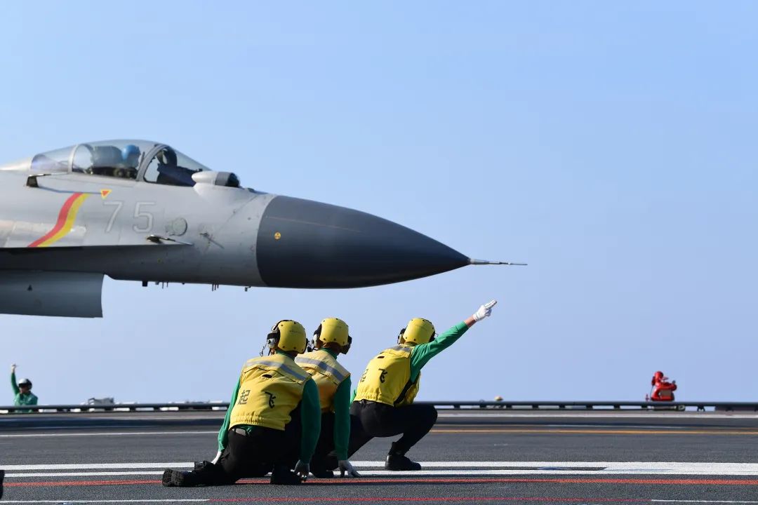 海軍山東艦起降保障中隊官兵指揮艦載機起飛(李剛 攝)