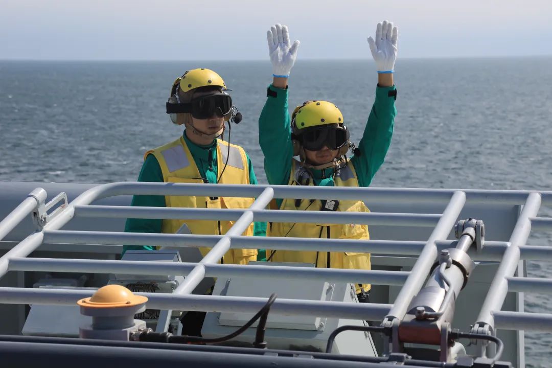 海軍山東艦起降保障中隊官兵給出“允許放飛”的手勢(李剛 攝)