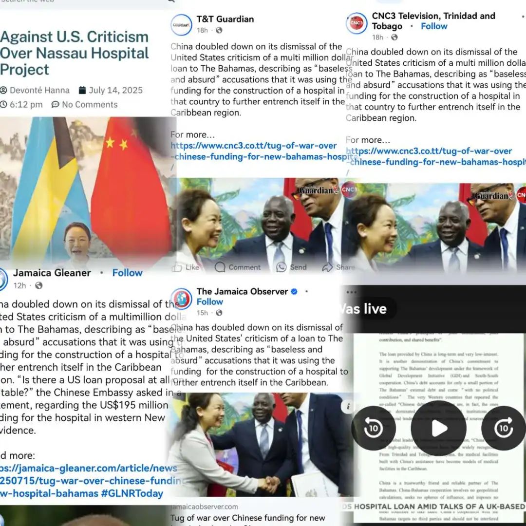 7月15日,巴主流紙媒分別在頭版頭條及頭版刊發報道《中國捍衞醫院優貸》、《中方回應:美國拿出任何貸款方案了麼?》,完整引述我使館發言人表態。目擊者新聞網等巴主流網媒以及牙買加、圭亞那、特立尼達和多巴哥等加勒比地區主流媒體充分報道中國駐巴哈馬使館發言人表態。