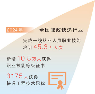 培訓“傳幫帶”,大街小巷跑出快遞員工匠。2024年,全國郵政快遞行業完成一線從業人員職業技能培訓45.3萬人次,新增10.8萬人獲得職業技能等級證書、3175人獲得快遞工程技術職稱。