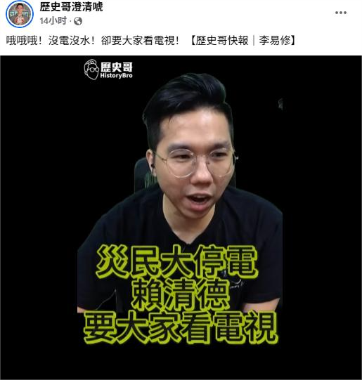“歷史哥”李易修在其直播節目中分享賴清德勘災視頻時諷刺説,“賴清德‘高光時刻’太多了,我們繼續看”。他説,賴清德在台南市七股區勘災時稱,“大家都辛苦了,我也跟大家説聲,陪個失禮、講一個歹勢(抱歉)啦,讓大家停電停水這麼多天……台電大家都知道,電視大家都有看到,沒日沒夜在修復!”賴清德還向當地民眾喊話,“咱市政府(對民眾)有哩(有在)出力、有哩關心,有哩給我們支持。‘行政院’也有這樣做,大家同意否?這樣好不好?這樣我們幫市政府掌聲鼓勵一下好不好?那也幫卓榮泰‘卓院長’鼓勵一下好不好?”