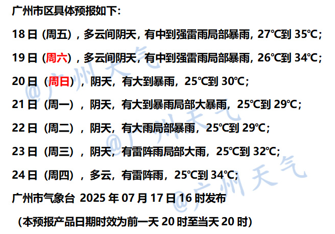 廣州市區,18日,多雲間陰天,有中到強雷雨局部暴雨,氣温在27℃~35℃;19日,多雲間陰天,有中到強雷雨局部暴雨,氣温在26℃~34℃;20日,大到暴雨,氣温在26℃~30℃。