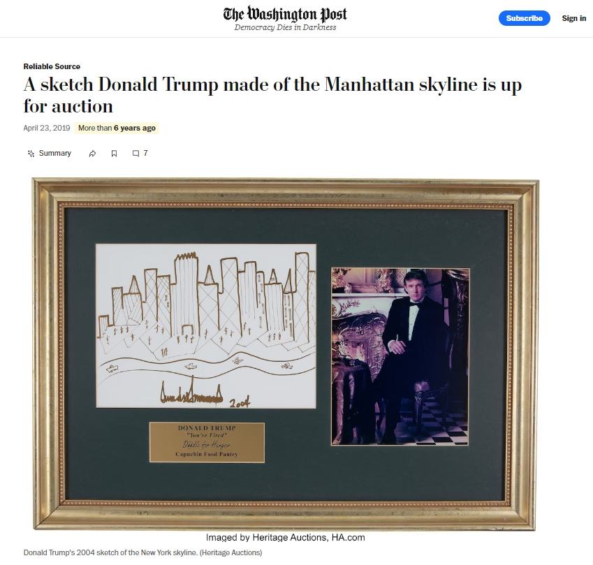 今日俄羅斯(RT)18日援引美國《國會山報》2017年一篇報道稱,特朗普其實畫過畫,他2005年畫的一幅“曼哈頓天際線”簡筆畫在拍賣會上拍出了近3萬美元的價格。