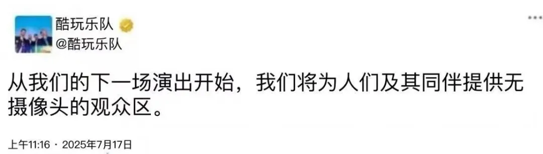 Coldplay(酷玩樂隊)發文回應演唱會拍下高管婚外情:“從我們的下一場演出開始,我們將提供無攝像頭的觀眾區。”