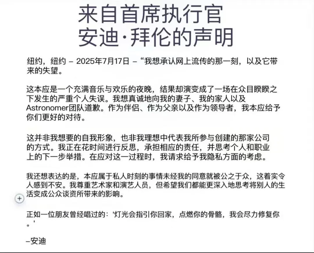當地時間7月17日,拜倫發表聲明向妻子和家庭以及公司團隊道歉。但是在聲明的結尾,他指責演唱會的攝像頭侵犯了他的隱私。