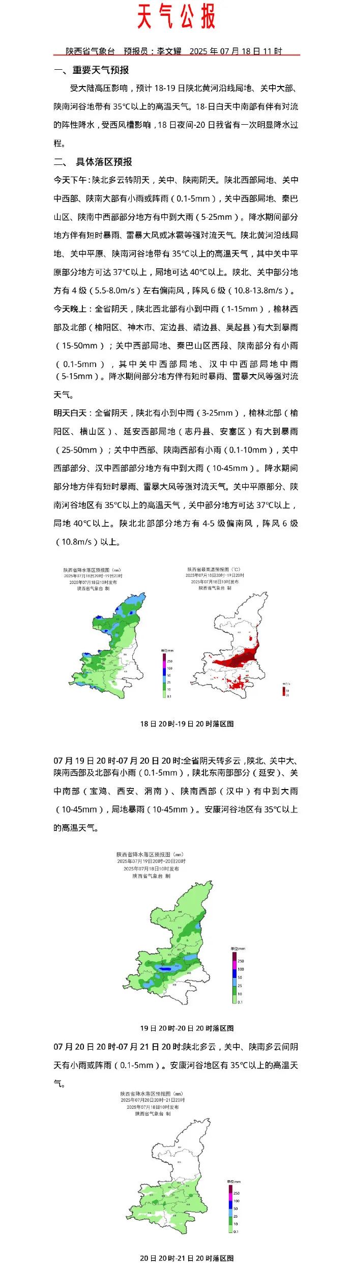 陝西省氣象台2025年07月18日09時30分發布高温黃色預警:受大陸高壓影響,預計7月18日陝北黃河沿線局地、關中平原大部、安康河谷地帶局地有35℃以上的高温天氣,其中西安北部、咸陽南部、渭南部分地方最高氣温可達37℃以上,渭南中部局地最高氣温可達40℃以上。7月19日陝北黃河沿線局地、關中平原中東部部分、陝南河谷地帶部分地方有35℃以上的高温天氣,其中西安北部、咸陽南部、銅川南部、渭南部分地方最高氣温可達37℃以上,渭南中部局地最高氣温可達40℃以上。
