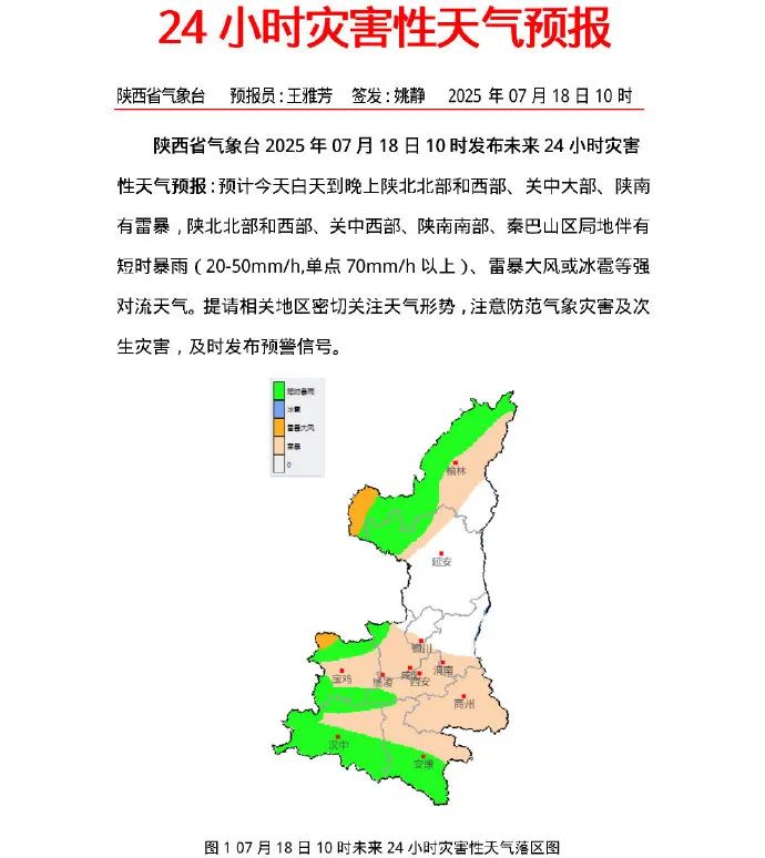 陝西省氣象台2025年07月18日10時發佈未來24小時災害性天氣預報: