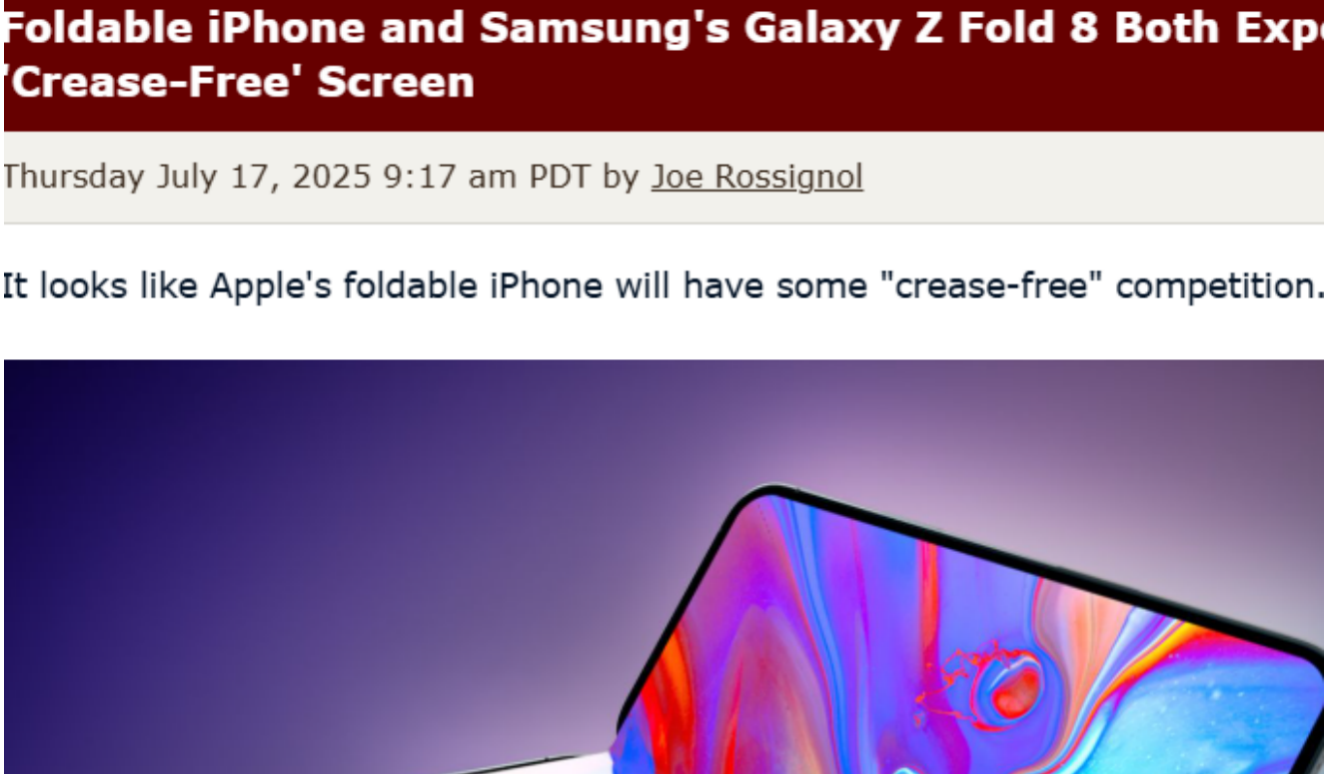 【環球網科技綜合報道】7月18日,據外媒報道,蘋果可摺疊iPhone將迎來強勁對手,三星Galaxy Z Fold 8也有望採用“無摺痕”屏幕。