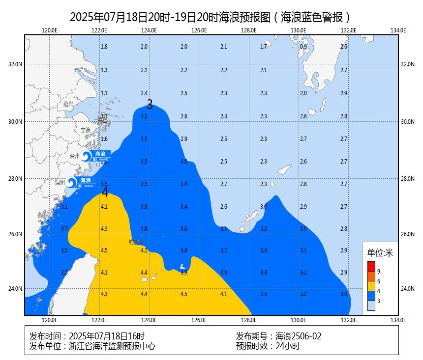 浙江省海洋監測預報中心根據《海洋災害應急預案》發佈海浪藍色警報。