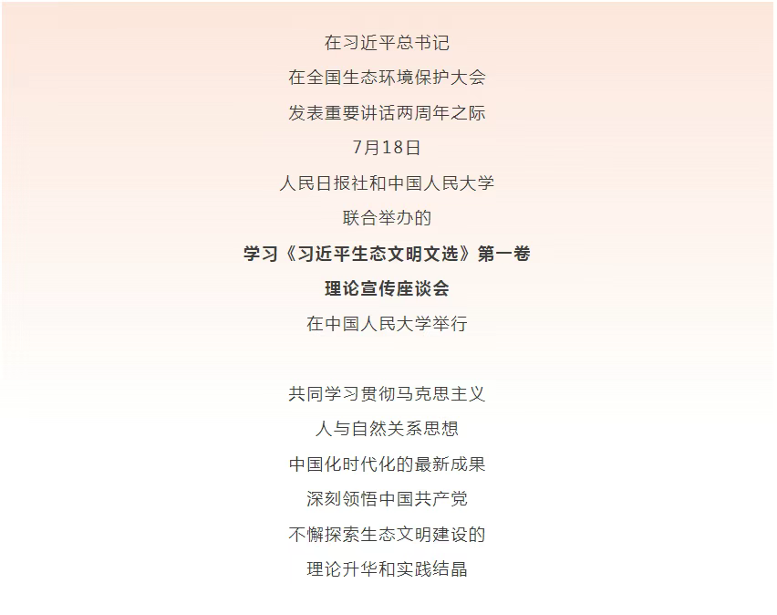 人民日報社總編輯陳建文、副總編輯方江山,中國人民大學校長林尚立,生態環境部黨組成員、副部長於會文,農業農村部黨組成員、副部長麥爾丹·木蓋提,國家林業和草原局(國家公園管理局)黨組成員、副局長李雲卿,中國工程院院士、全國生態保護與建設專家諮詢委員會主任尹偉倫,全國政協農業和農村委員會委員、中國社會科學院農村發展研究所黨委書記、中國生態經濟學學會理事長杜志雄,習近平生態文明思想研究中心主任、生態環境部環境與經濟政策研究中心黨委書記、主任胡軍,中國人民大學常務副校長朱信凱等出席會議。