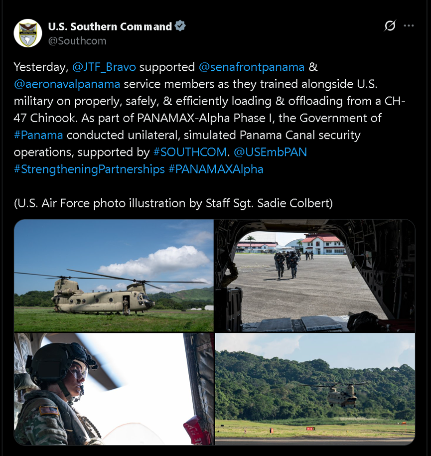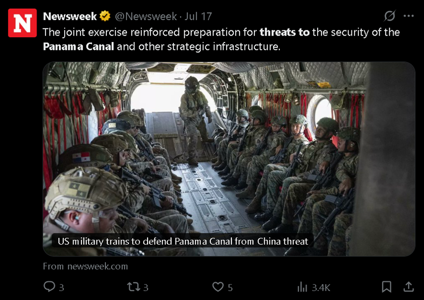 從《新聞週刊》的介紹來看,這場美軍與巴拿馬軍隊剛剛結束的軍演,是今年4月雙方一次聯合軍演的後續部分,代號為PANAMAX-Alpha。這場軍演的大背景,是美國特朗普政府自今年以來持續圍繞巴拿馬運河炒作的“中國威脅論”。美國國防部長皮特·赫格塞思在今年4月要求美軍的南方司令部(U.S. Southern Command)擴大與巴拿馬軍隊的“安全合作”,從而“保護”巴拿馬運河不被中國“影響”。