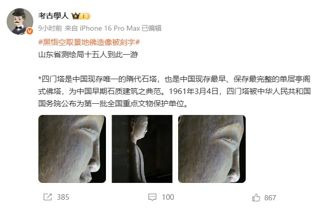7月17日,有網友稱山東濟南四門塔一造像側臉被刻上“某省測繪局十五人到此一遊”字樣,該網帖被某考古大V轉發,引發關注。