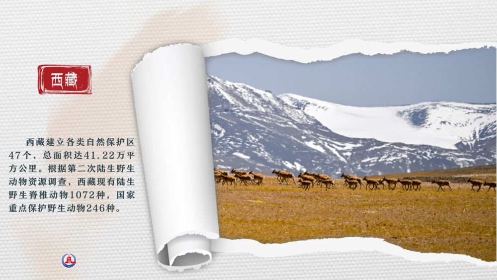 西藏建立各類自然保護區47個,總面積達41.22萬平方公里。根據第二次陸生野生動物資源調查,西藏現有陸生野生脊椎動物1072種,國家重點保護野生動物246種。
